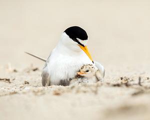 Least Tern and chick nestled under moms protective wing.