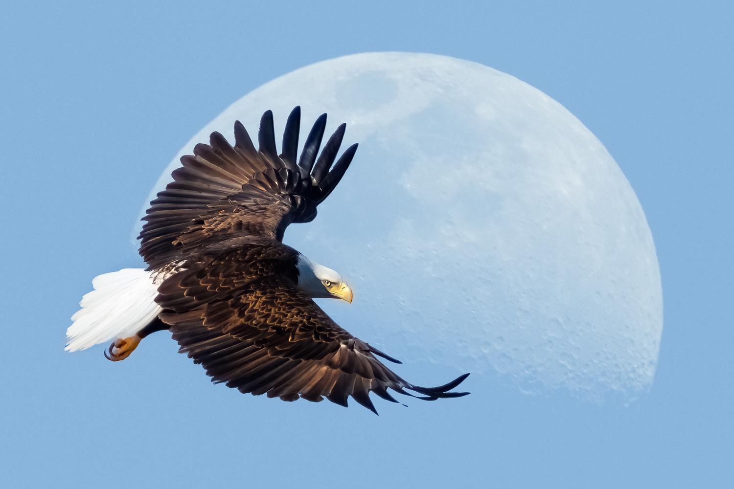 Adult bald eagle photographed in Orleans against a beautiful moon. I was go excited that I caught him right as he turned to give me a look.
