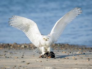 Snowy Owls migrate here primarily for food. Their diet largely consists of sea ducks. I have hesitated to show this image as I received some backlash about the duck. If the Snowy Owl did not feed it would not survive. This is nature.