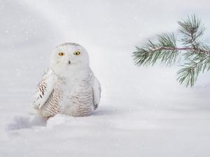 This snowy owl was actually hunting for voles. She dove down into the snow from a roof top and missed her target. Before she flew off she looked my way and I was able to get a quick shot. Just a beautiful bird! Good luck Snowy!