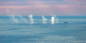 Photographed during a sunset trip on the Whale Watcher. A group of six whales feeding together in the distance. Stunning when printed on metal.