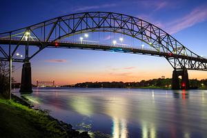 Night shot of the Bourne Bridge with the Railroad Bridge in the background. Slowing down my shutter allowed me to get the smooth silky appearance to the water.