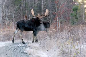 Two beautiful bull moose in the wee hours of a brisk New Hampshire morning. It is on the cusp of Winter so eating as much as they can before the snow falls is key!